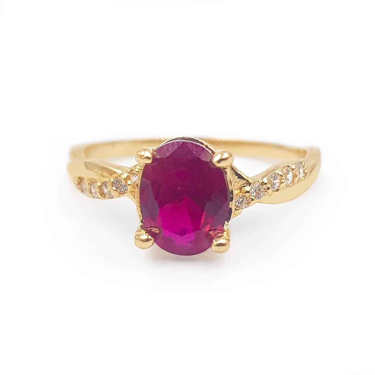 Anillo solitario con engaste central oval de cristal color red y aro cruzado con micro engastes de cristales blancos, elaborado en Oro 18k.