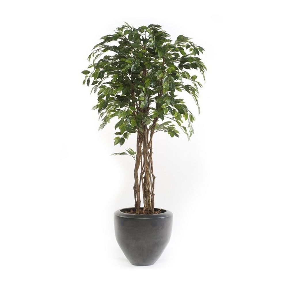 Árbol Ficus ECO, gran ejemplar con excelente relación calidad precio, incluye multitronco natural con hojas enteladas en color verde intenso de máximo nivel de frondosidad en su copa definida y realista. Disponible en dos alturas. Se sirve con macetero básico incluido.
