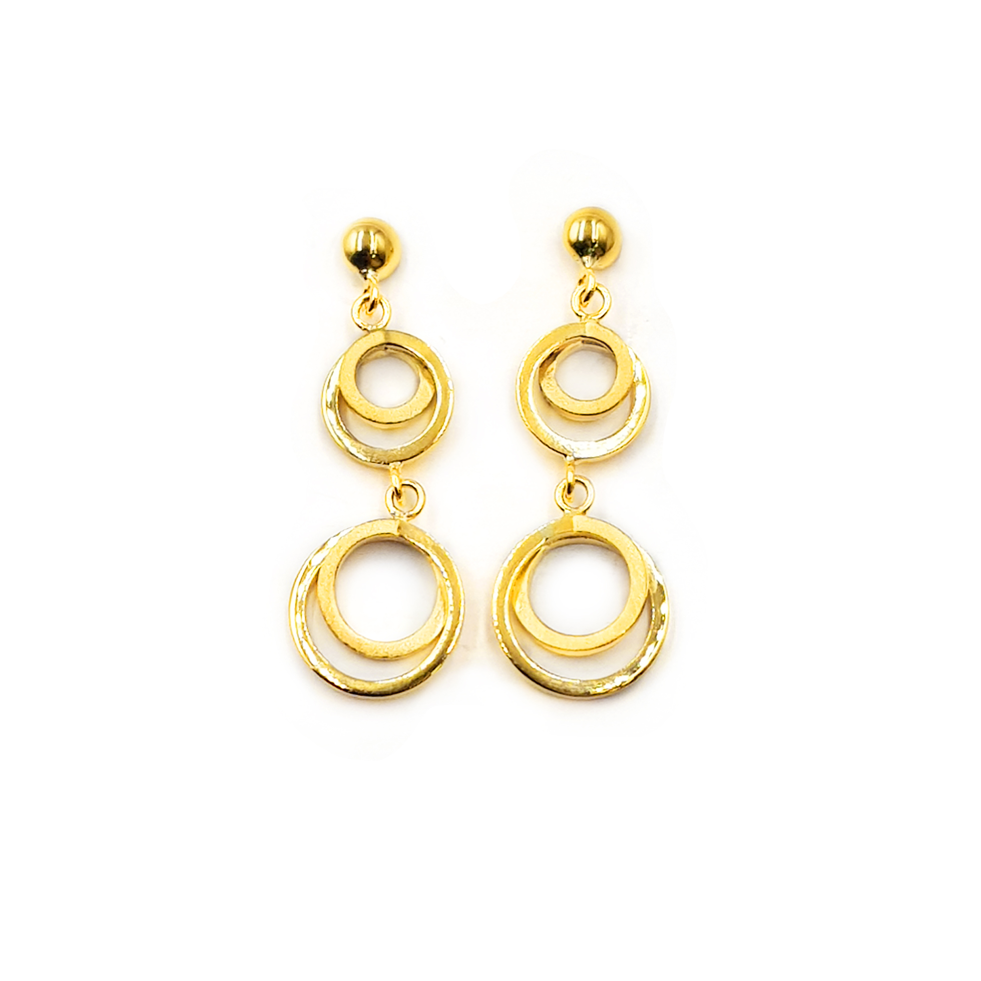 Estos deslumbrantes aretes dorados colgantes presentan un diseño único y elegante, compuesto por círculos de tamaños crecientes.