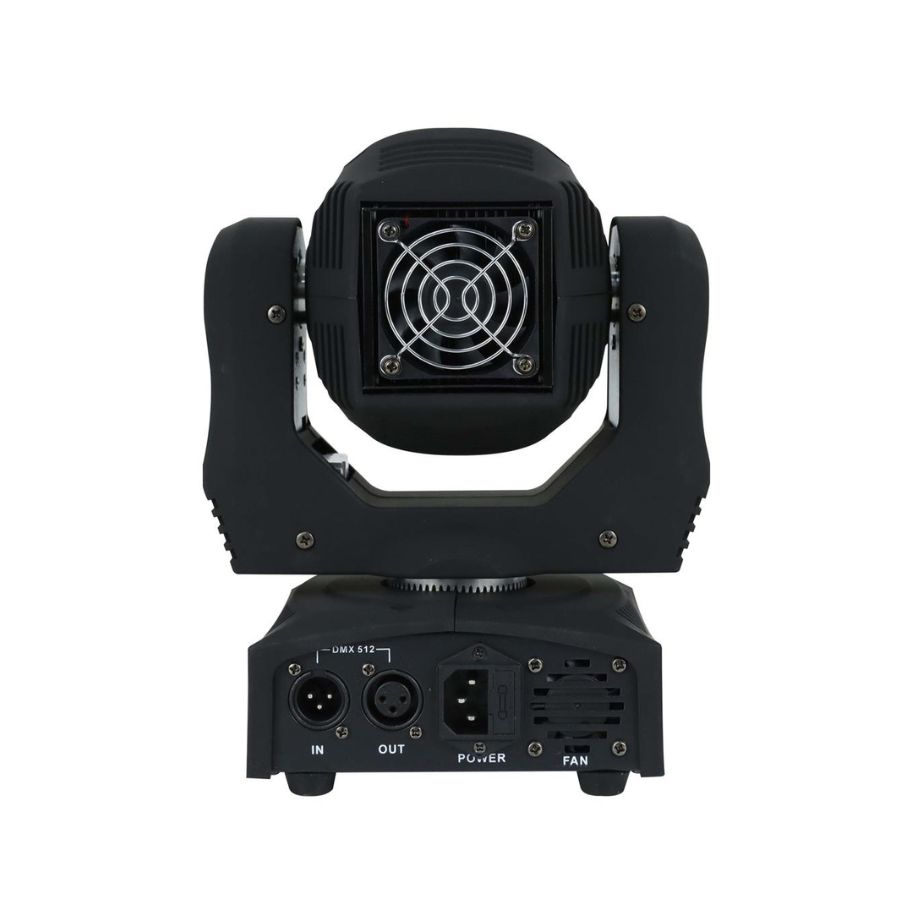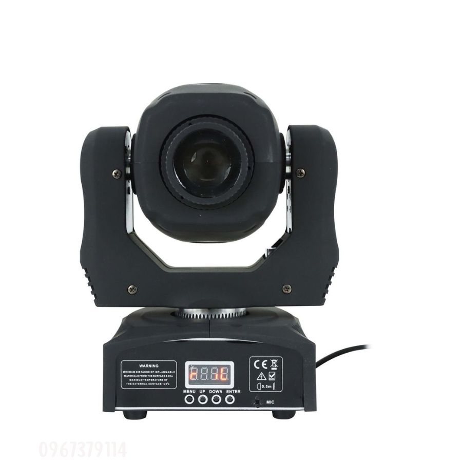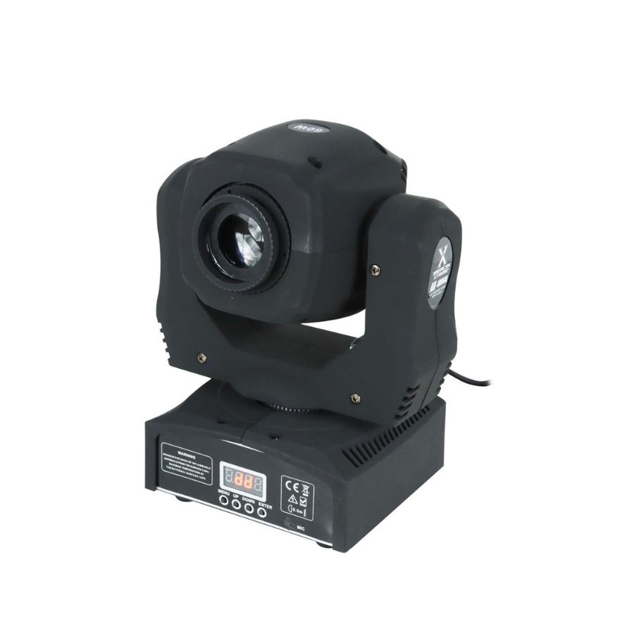 Especificaciones: – Tipo de luz: led de alta potencia CREE 60W – Modos de funcionamiento: Auto, Sonido, DMX, Maestro-esclavo – Canales DMX: 9/11 – Movimientos: 540 grados en eje X (PAN), 270 grados en eje Y (TILT) – Paleta de colores: 7 colores + blanco – Rueda de gobos: 7 gobos (plantillas de formas) + vacío – Programación mediante botones y display – Potencia total: 70W