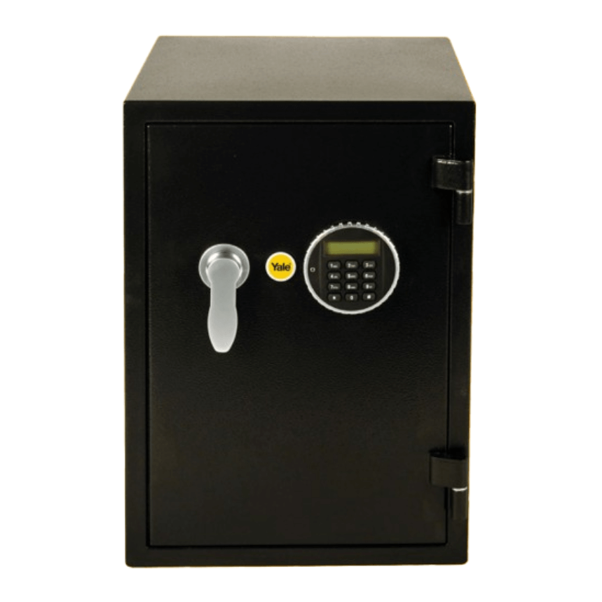 Caja fuerte resistente al fuego de doble pared de acero de 0.8 mm de grosor con capa de concreto en el medio para efecto cortafuego. Se puede programar hasta 2 códigos (1 de usuario y 1 maestro) Pantalla LCD azul y teclado digital. Alarma de batería baja.