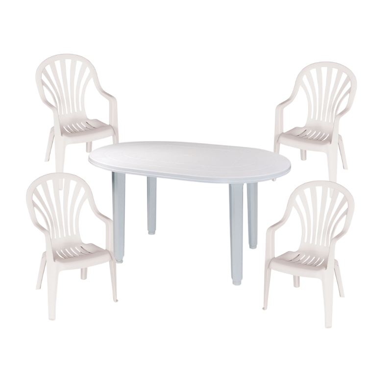 Conjunto de Jardín Blanco de Resina: Transforma tu espacio exterior con el Conjunto de Jardín Blanco de Resina, que incluye 4 sillas de resina Telma blanca y una elegante mesa Alya. Las sillas Telma cuentan con un respaldo alto para una mayor comodidad, lo que las convierte en la opción perfecta para relajarte con tus seres queridos en tu jardín o terraza. Fabricadas en resina de alta calidad, son ideales para exteriores gracias a su resistencia a la intemperie y su protección anti-rayos UVA que evita la decoloración del sol. Además, las sillas son apilables, lo que te permite ahorrar espacio en tu hogar. La mesa Alya, con unas dimensiones de 130×90 cm, ofrece un amplio espacio para tus invitados y objetos decorativos, creando un ambiente armonioso y acogedor. Con el Conjunto de Jardín Blanco de Resina, disfrutarás de un mobiliario resistente, fácil de mantener y perfecto para tu espacio exterior.