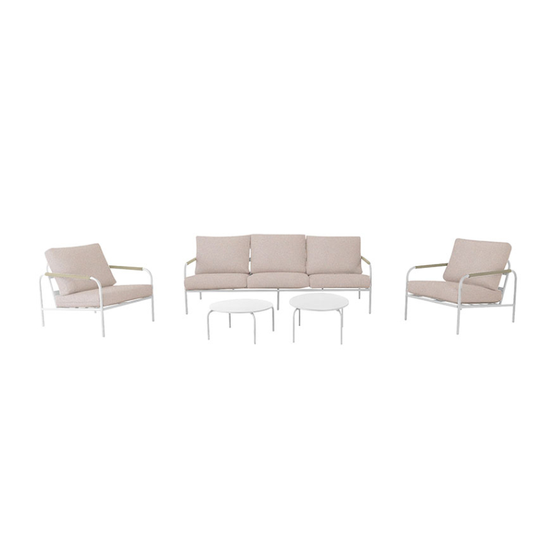 Este conjunto está compuesto por una estructura resistente de acero de 25 mm de diámetro, con un acabado en color blanco que aporta frescura y modernidad. Los reposabrazos adornados con cuerda beige de 5 mm complementan perfectamente el diseño. Los cojines de poliéster texturizado en color natural no solo ofrecen comodidad sino también un toque de sofisticación.