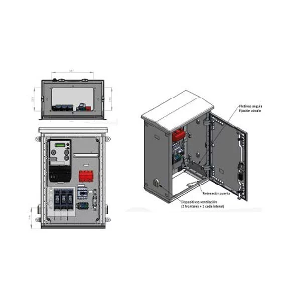 - Envolvente tipo MAXIPOL, de poliéster reforzado con fibra de vidrio color RAL 7035 y puerta con cierre de tres puntos, cerradura normalizada UFD.