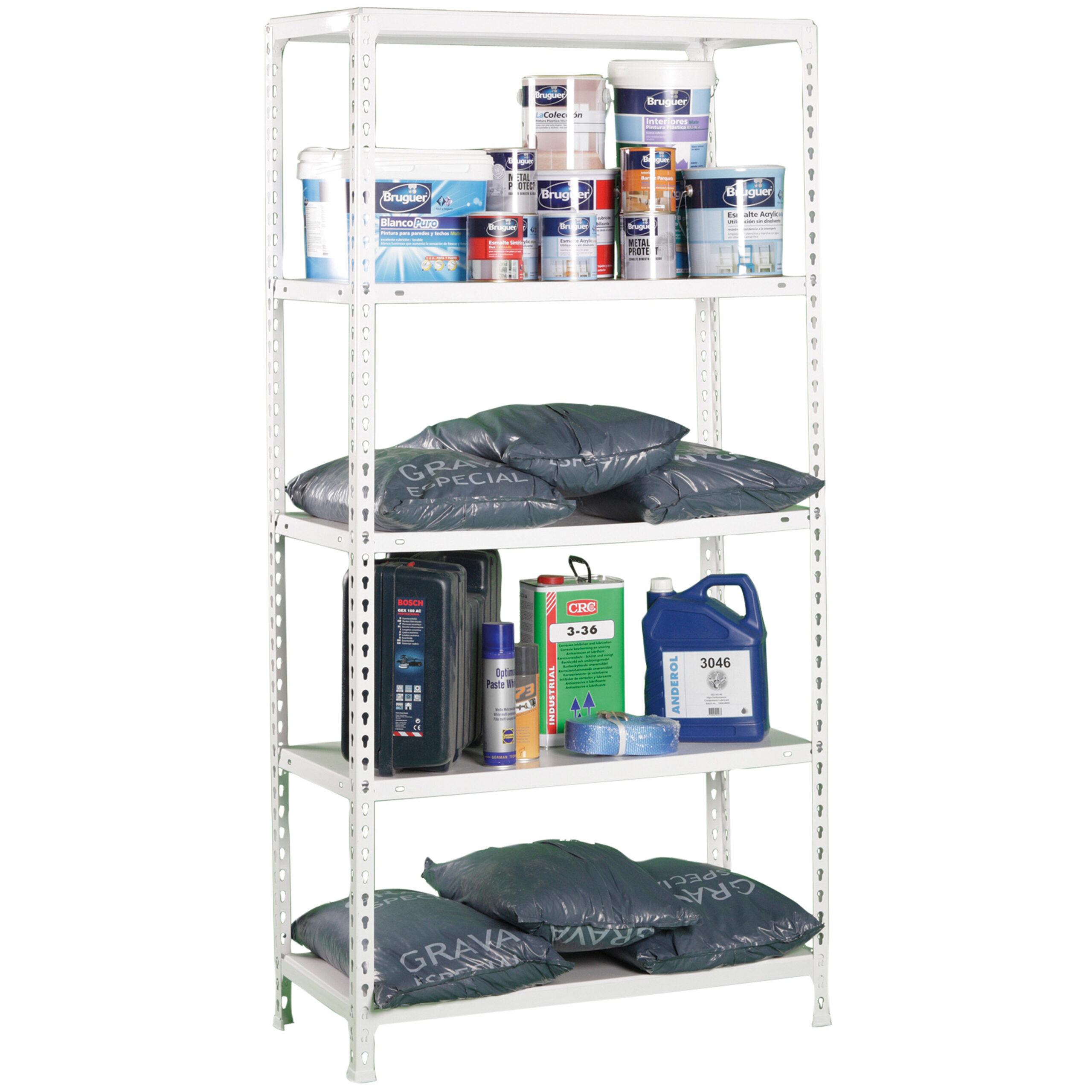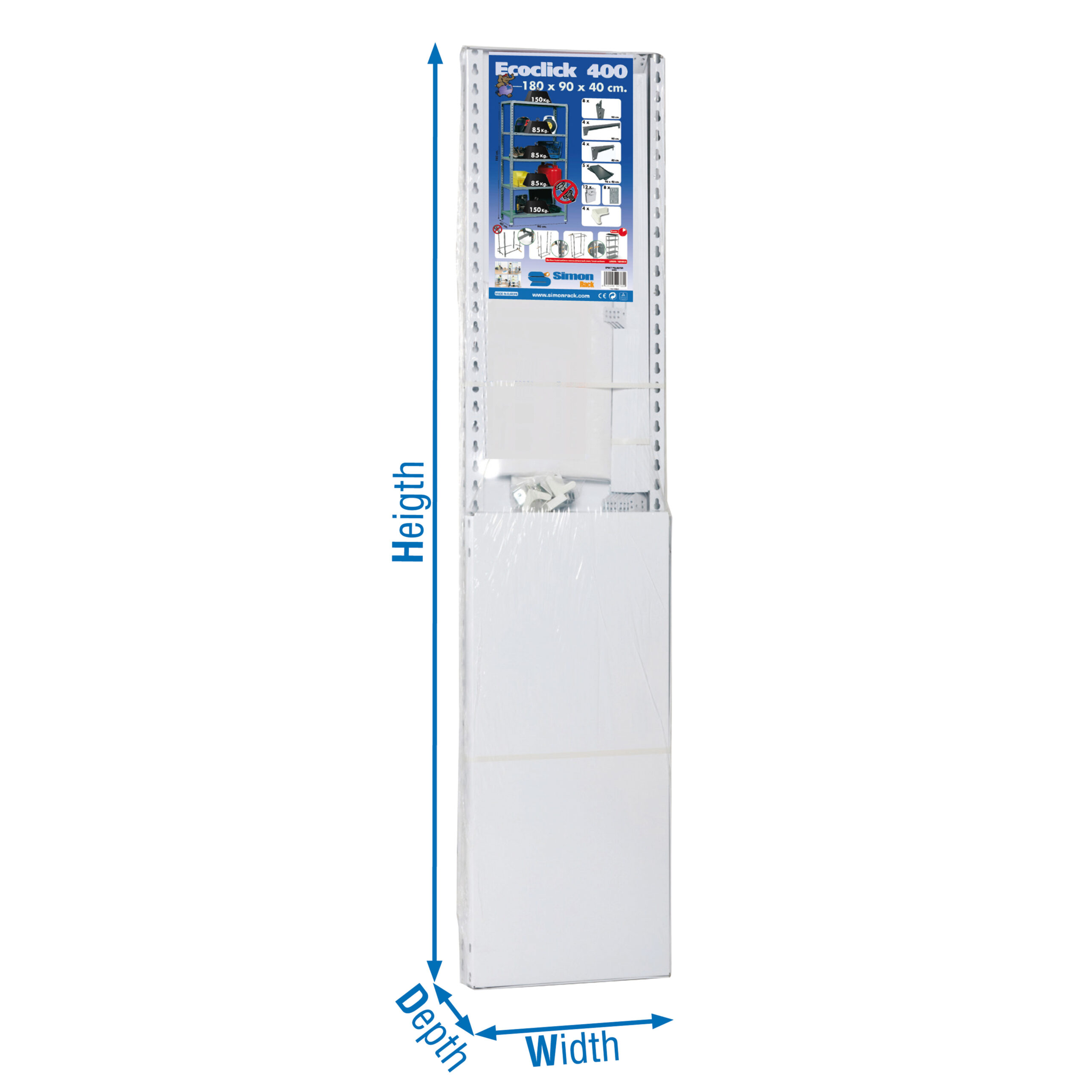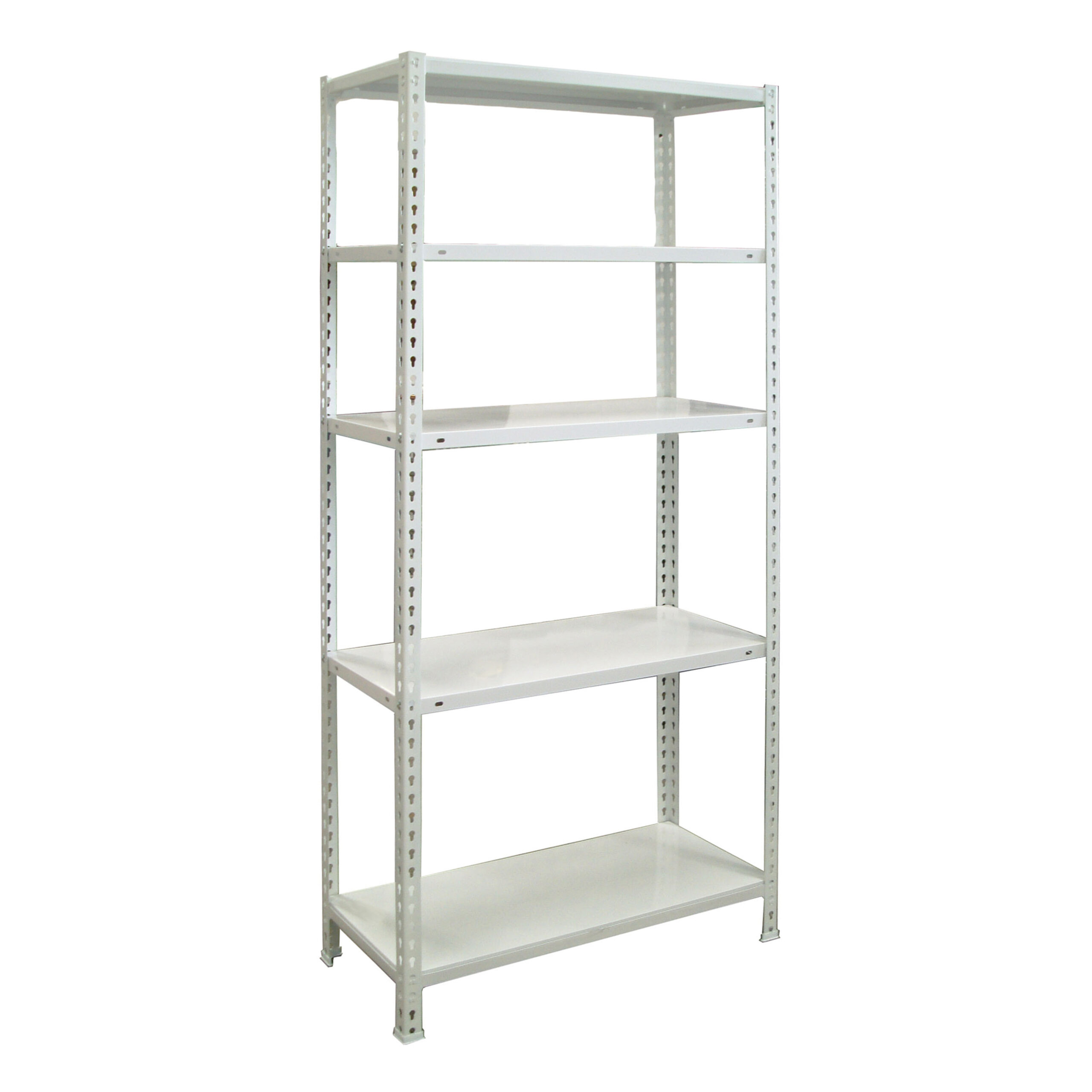 Estantería metálica sin tornillos. Color: BLANCO.Tiene 5 estantes. Dimensiones: 1800x800x300 mm.Capacidad de carga: 150 kgs los estantes superior e inferior y 70 kgs los estantes intermedios,certificamos a punto de flexión,no de rotura. No se tambalea,no tiene aristas de corte.Fabricado en España y se monta rápido siguiendo las instrucciones.