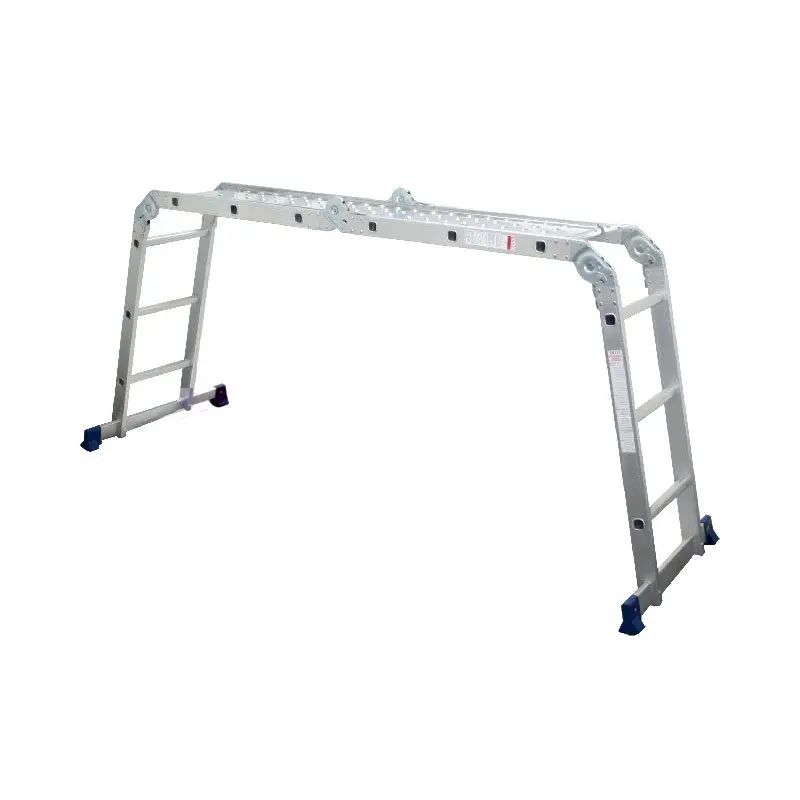 Escalera polivalente 10086 de aluminio con 4×3 peldaños y plataforma, puede utilizarse en varias configuraciones. Carga máxima de 150 kg y altura máxima de elevación de 3,7 m y peldaño superior de acero.