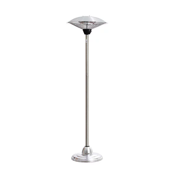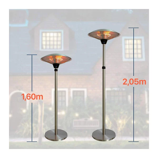- A TU GUSTO. 2 resistencias halógenas garantizan un rápido calentamiento, con una gran eficacia y un bajo consumo. Cable de alimentación de 1,80 metros para que instales la estufa de terraza en el lugar más conveniente. Puedes regular la potencia entre 900, 1200 y 2100W en función de tus necesidades y la climatología exterior. Regula la altura gracias al pie telescópico y fija la fuente de calor donde más la necesites. La altura mínima son 1,60m y la máxima 2,05m.