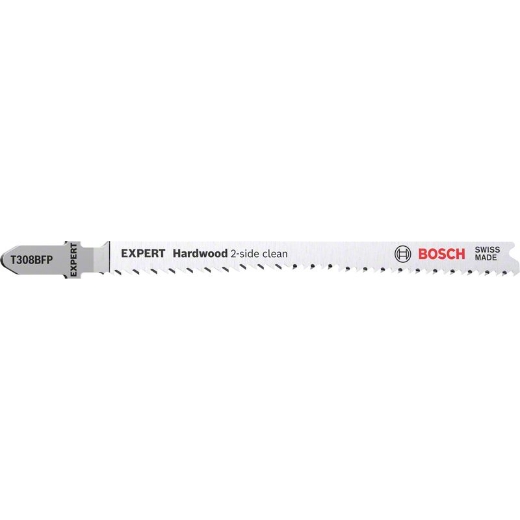 Acabado muy limpio en la parte superior e inferior – Asegurar que el “lado limpio” de un corte realizado con sierra de calar está en la parte visible del material de trabajo siempre ha sido un arte para los carpinteros y los montadores. A veces puedes dar la vuelta a la pieza de trabajo, otras veces la sierra de calar se puede sostener desde abajo. O puedes utilizar EXPERT ‘Hardwood 2-side clean’, que ofrece un corte perfecto sin desgarros por ambos lados gracias a sus dientes dispuestos en sentido contrario. Con el ingenioso diseño de estas hojas de sierra de calar ya no es necesario realizar ningún trabajo después de cortar: los dientes evitan que haya desgarros tanto en el movimiento ascendente como en el descendente. Esto es perfecto para los profesionales que desean ahorrar tiempo y a la vez proporcionar un trabajo de máxima calidad a sus clientes. Fabricada con bimetal, una tira de acero rápido adherida a una hoja de acero flexible para combinar resistencia y flexibilidad, la hoja de sierra de calar Bosch EXPERT ‘Hardwood 2-side clean’ es lo suficientemente robusta como para cortar encimeras de cocina de aglomerado laminado o madera dura. Disponible para realizar cortes rectos (T308BF) y cortes en ángulo de alta precisión (T308BFP) sin desgarros Compatible con todas las sierras de calar con vástago de inserción en T.