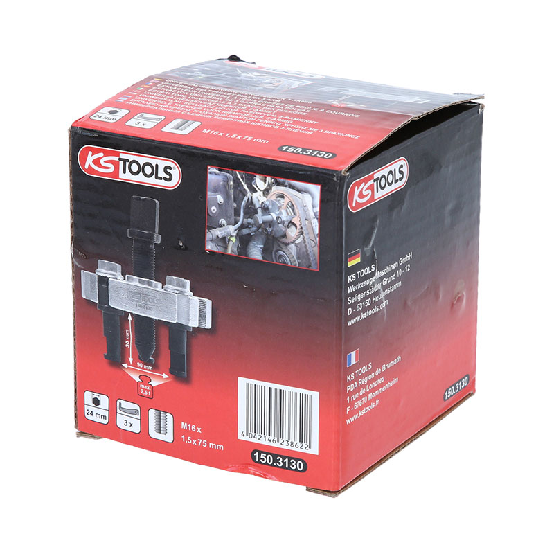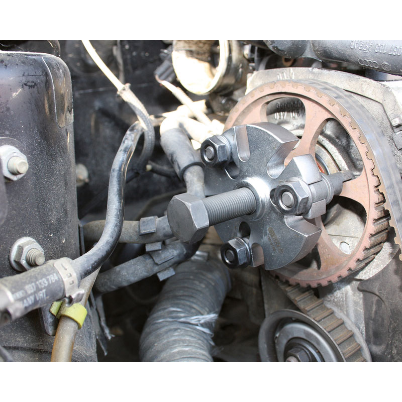 Extractor de poleas universal de 3 brazos con abertura máxima de 70 mm para extraer sin dañar la polea de la correa de distribución.