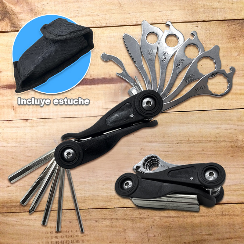 Material Acero inoxidable Pl stico Tama o Aprox 19 x 3 x 3 5 cm abierto Peso producto 199 g Tama o empaque 6 5 x 10 x 4 cm Peso empaque 211 g Es el regalo perfecto para las personas que les gusta acampar o viajar en bicicleta F cil de transportar y conveniente para viajes Viene con estuche que incluye herramientas como Llaves de 8mm 9mm 10 mm 12 mm 14 mm mini Navaja aserrada CR V 4mm 5 mm 6mm destornillador de estrella y otras tiles herramientas Un producto pensado para aquellas personas que buscan la comodidad en actividades al aire libre como camping ciclismo entre otros Un kit pr ctico y muy f cil de llevar siempre contigo y de manera ordenada gracias al pr ctico estuche que se incluye Viene con un sistema de dos piezas separadas que se acoplan por medio de broches entre las dos partes para un f cil almacenamiento Contenido del Paquete1 Herramienta multiusos ref 2591 Estuche para almacenamiento100 Nuevo