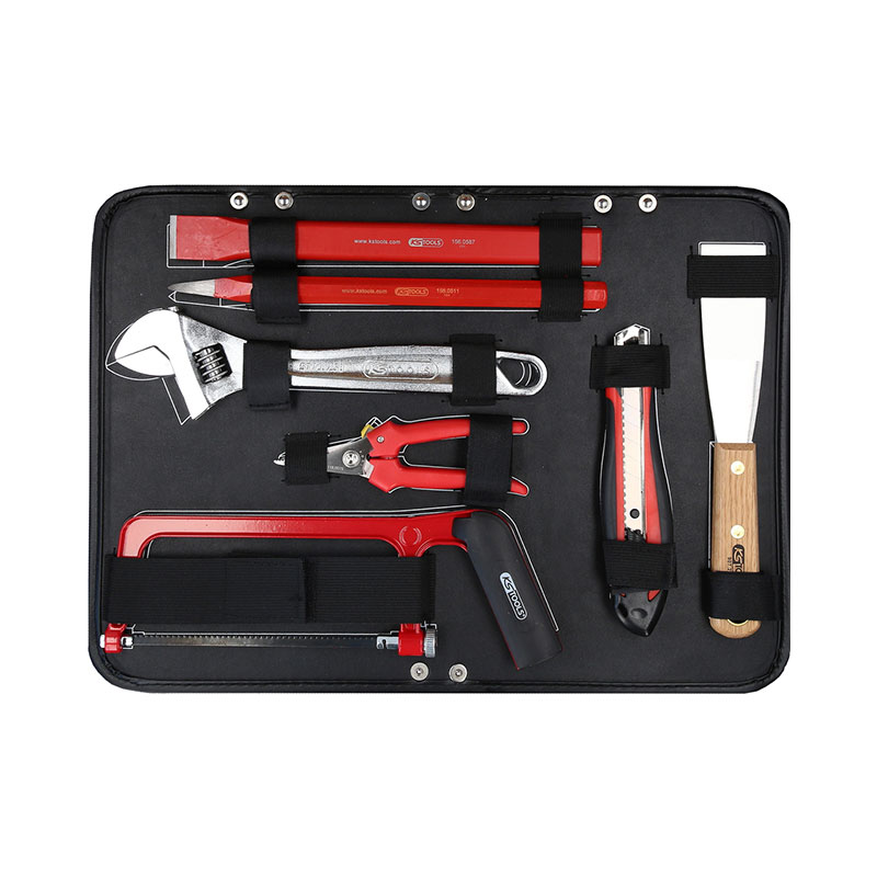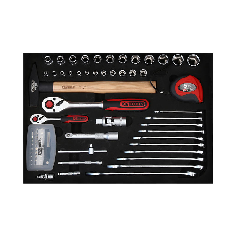 – 1x Cuchillo de confort con hoja desmontable, 170 mm; – 1x Carraca reversible 1/4″, 72 dientes: – 12x KS 917.1210 Llave de vaso hexagonal de 1/2″, 10 – 11 – 12 – 13 – 14 – 15 – 16 – 17 – 18 – 19 – 21 – 22mm; – 12x KS 917.