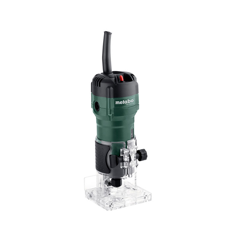 paralelo, dispositivo copiador y guía de rodillos; – Ajuste preciso y continuo de la profundidad y fijación de la unidad del motor mediante la rosca de cremallera; – Placa base transparente para una visibilidad máxima de la fresa y la pieza; – Protección contra el reinicio: evita el arranque involuntario tras cortes de corriente; – Escobillas de carbono Autostop para la protección del motor.