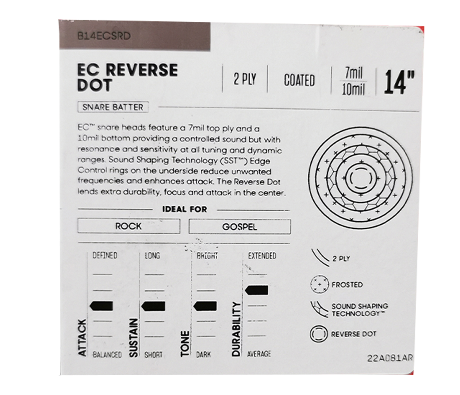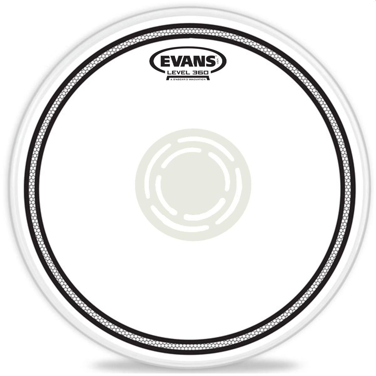 Este parche Evans para tarola está fabricado con dos capas de película, una de 7 y otra de 10 milésimas de pulgada. Cuenta con el sistema interno Edge Control que reduce armónicos y sustain. Cuenta con un refuerzo central invertido para que no interfiera con las escobillas.
