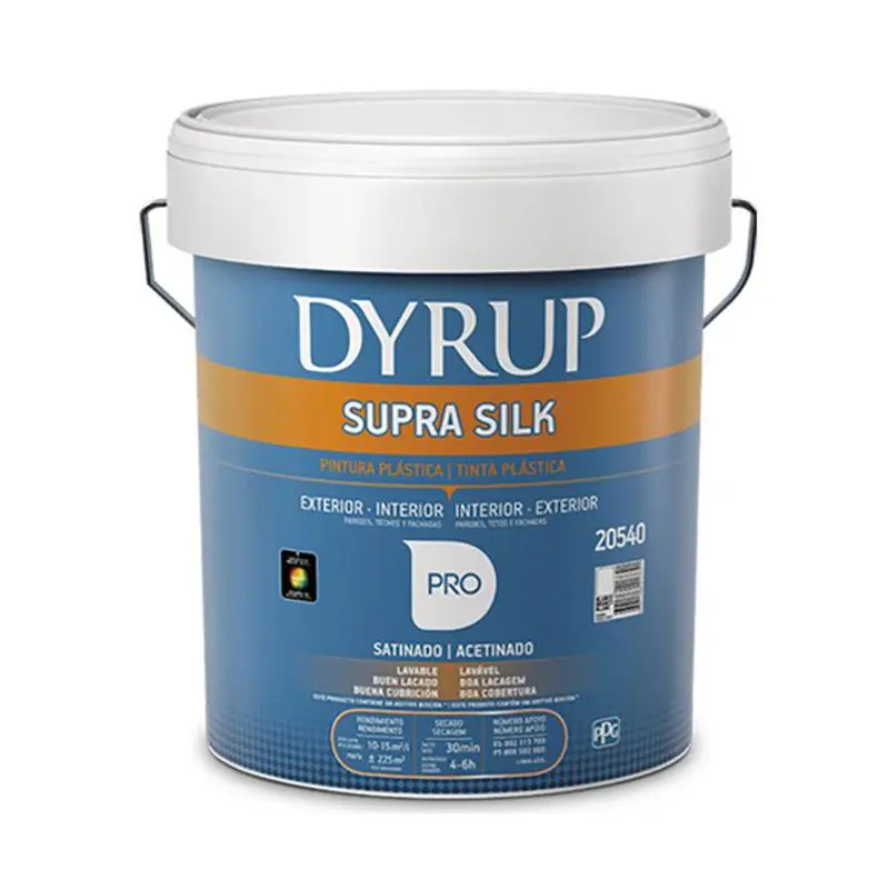 Las zonas que ya hayan sido atacadas deberán lavarse previamente con Dyruwash ref. 9360; – En interiores, en zonas propensas al crecimiento de moho (zonas húmedas, sombrías o poco ventiladas), aplique Pintura Plástica Supra Silk con un 10% en volumen de aditivo Antimoho y Antialgas ref. 5310.