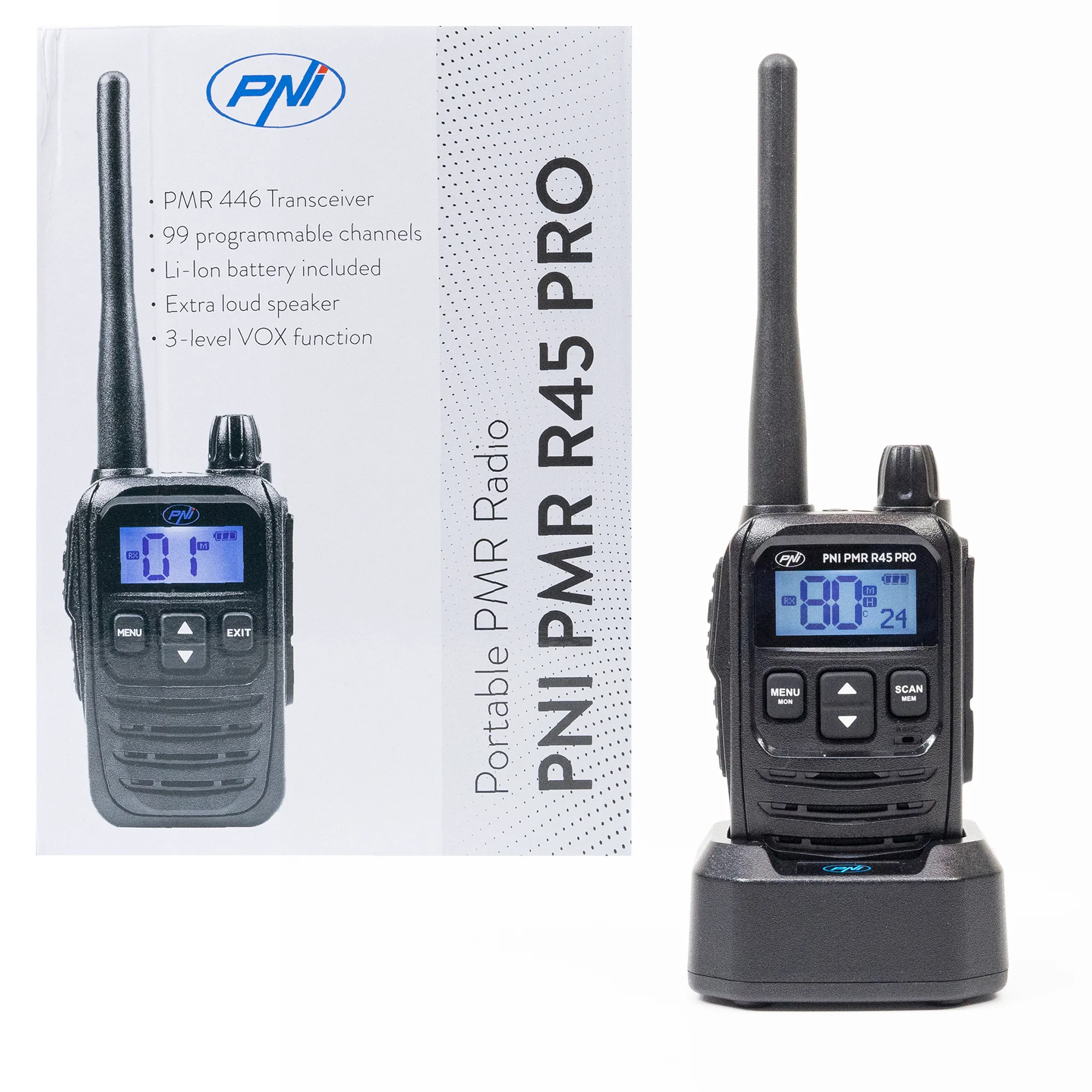 El PNI R45 Pro es un walkie talkie PMR-446 de uso libre, compacto de tamaño reducido, robusto y fiable para uso sin licencia de 99 canales, 16 canales PMR-446 con 38 CTCSS /104 DCS. Gracias a su batería de 2.000 mAh el R-45 Pro nos ofrece hasta 12 horas de autonomía de funcionamiento con un alcance de hasta 8 Km*