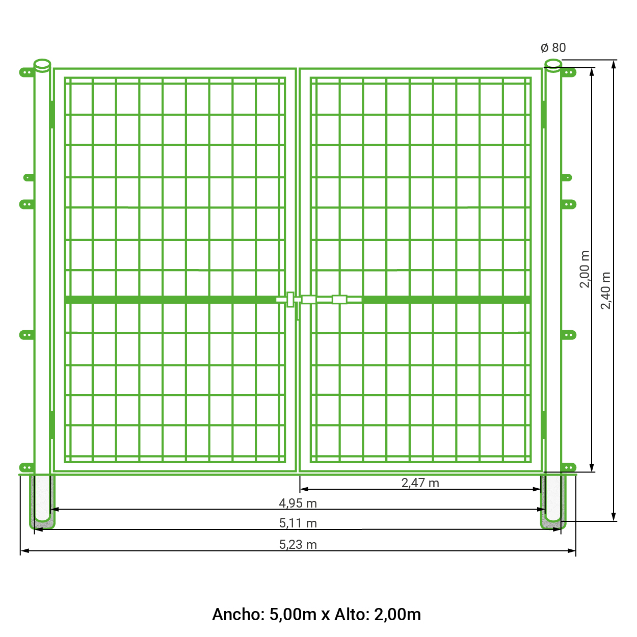 Puerta vehicular 2 hojas para malla simple torsión galvanizada 2,00 metros alto x 5,00 metros ancho