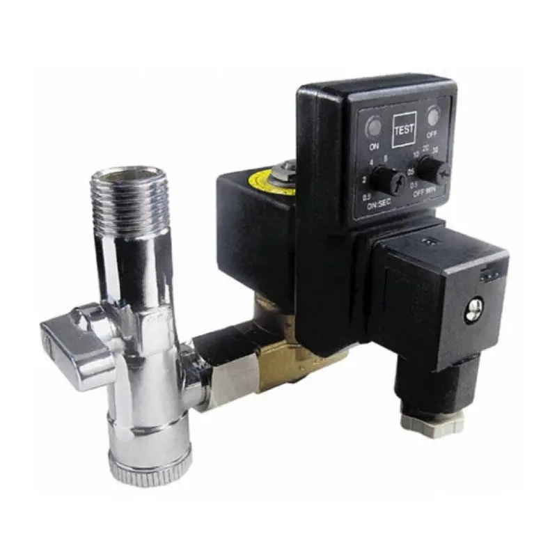 Purga automática de condensados con doble temporizador, con filtro de protección de acero inoxidable y válvula de bola G 1/2″, apta para depósitos.