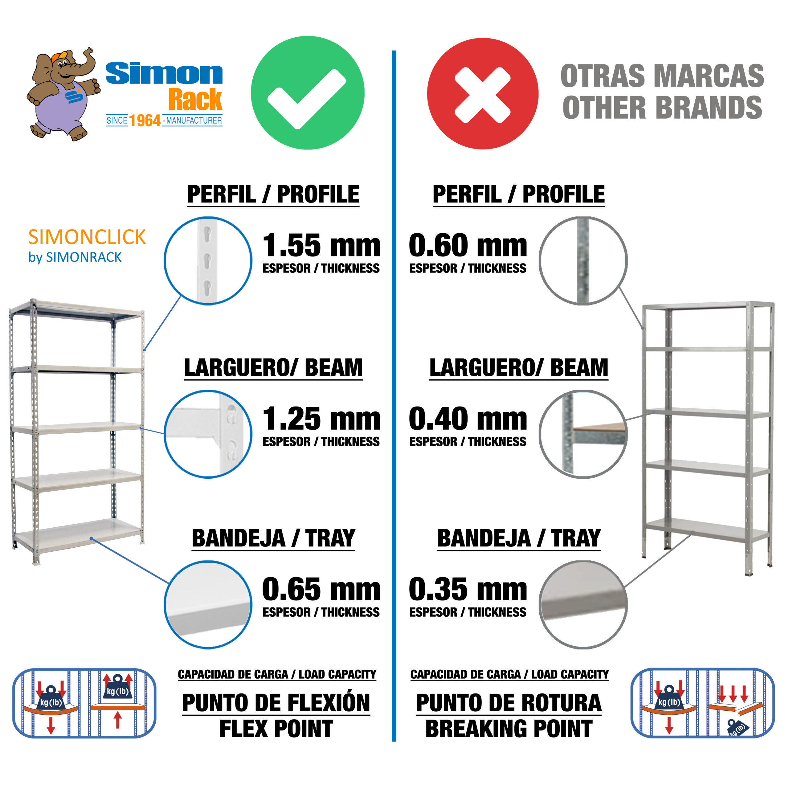 Estantería metálica sin tornillos de color BLANCO/BLANCO con capacidad de carga por estante de 180 kg. El número de estantes es 3 y las medidas (alto x ancho x fondo) son 900x900x300 mm. La única estantería que permite poner las bandejas en tres posiciones diferentes. Producto español, calidad europea, podrás encontrar las intrucciones de montaje en su interior o en este enlace: https://www.youtube.com/watch?v=u3t2f21Mm7I. Medidas en uso del producto: 877x910x310 mm