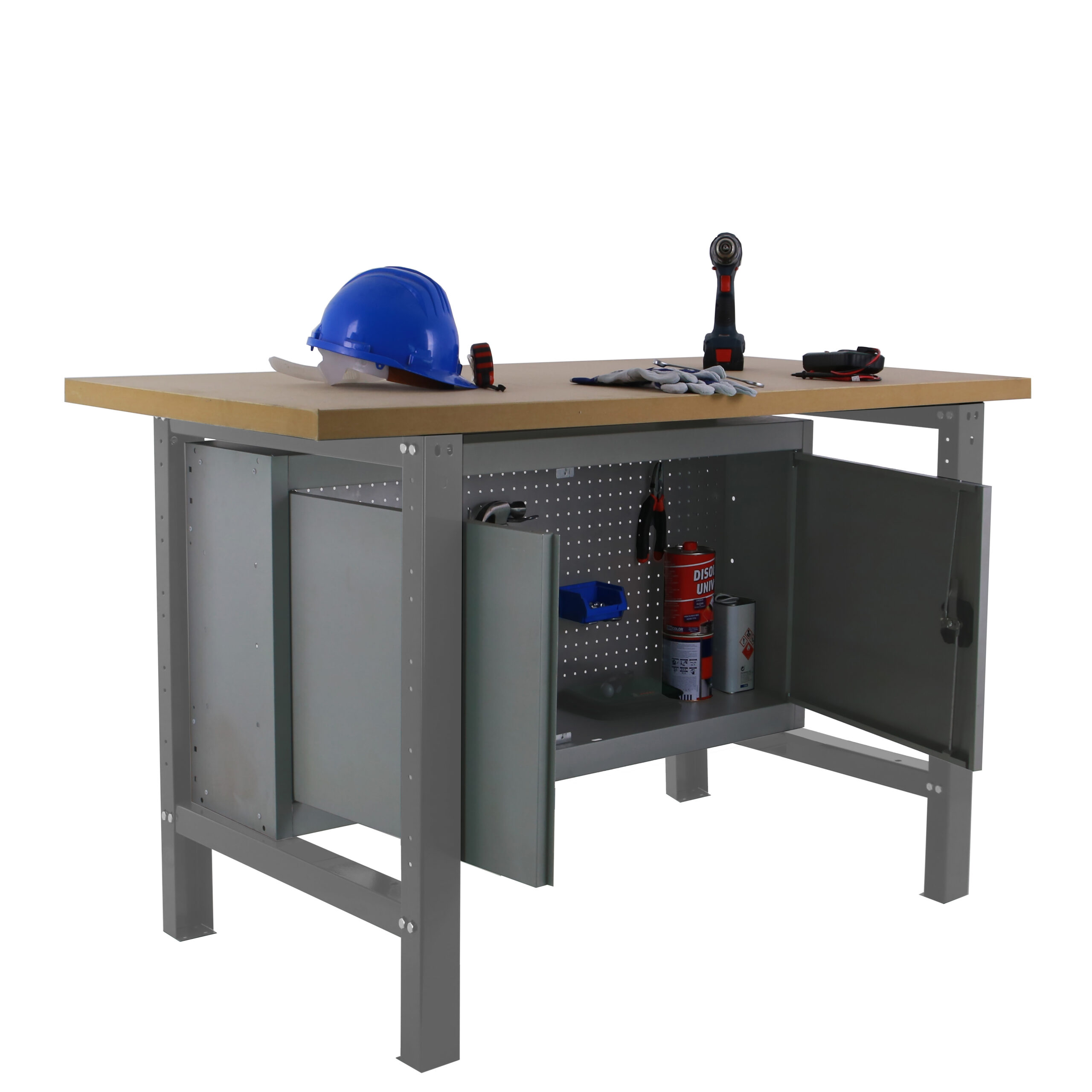 Banco de trabajo con tornillos y bandeja de MDF 35 mm. Incluye armario con cerradura para guardar herramientas. Es de color GRIS/MDF. Las dimensiones de este banco de trabajo son: 865x1200x750 mm. Y tiene una capacidad de carga de 600 kgs el estante. El armario aguanta hasta 50 kgs. Está fabricado en España y se monta fácil siguiendo las instrucciones.