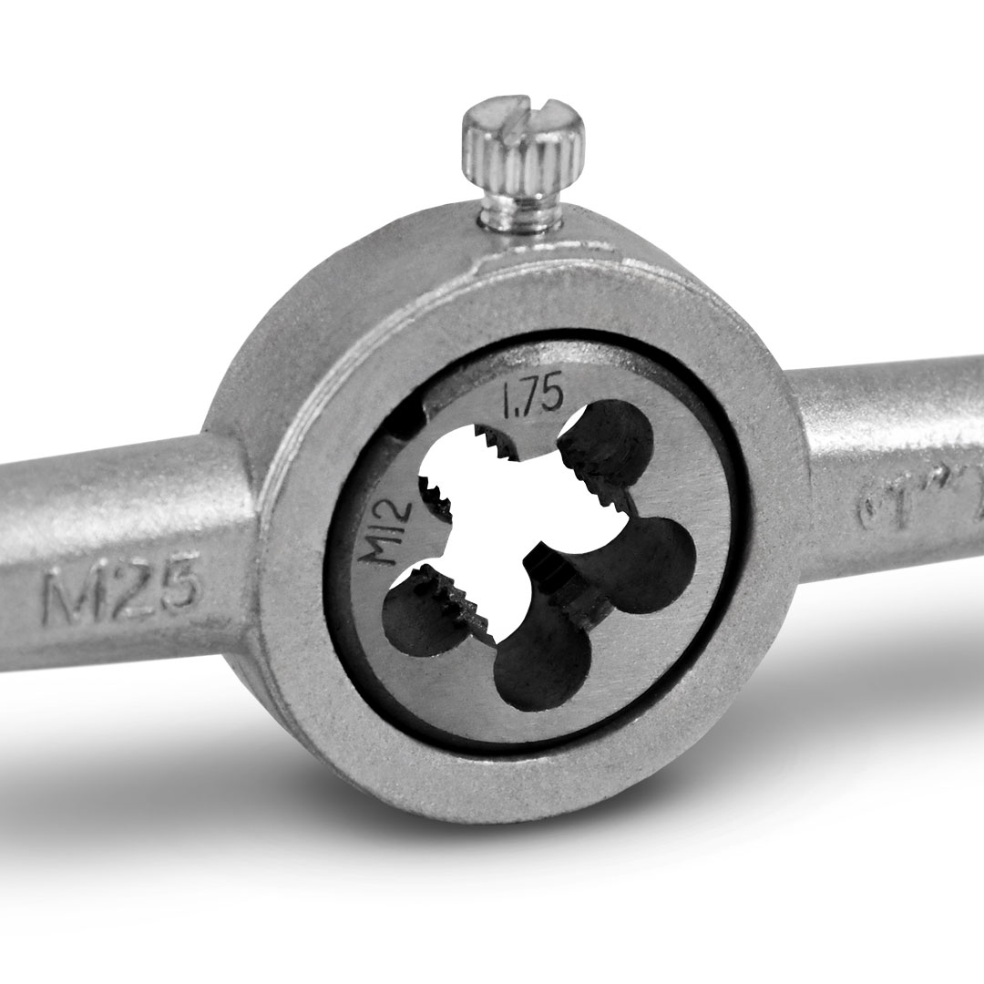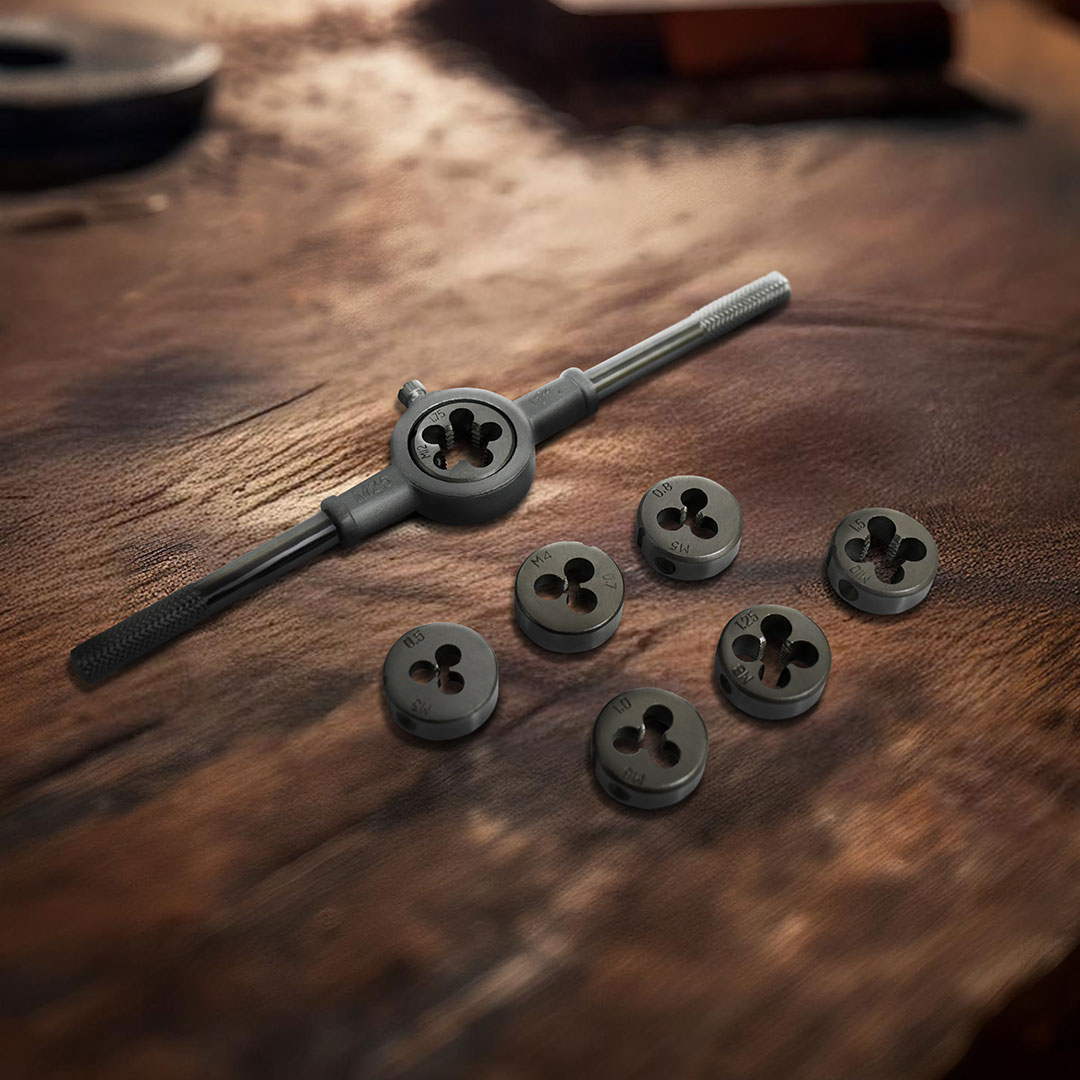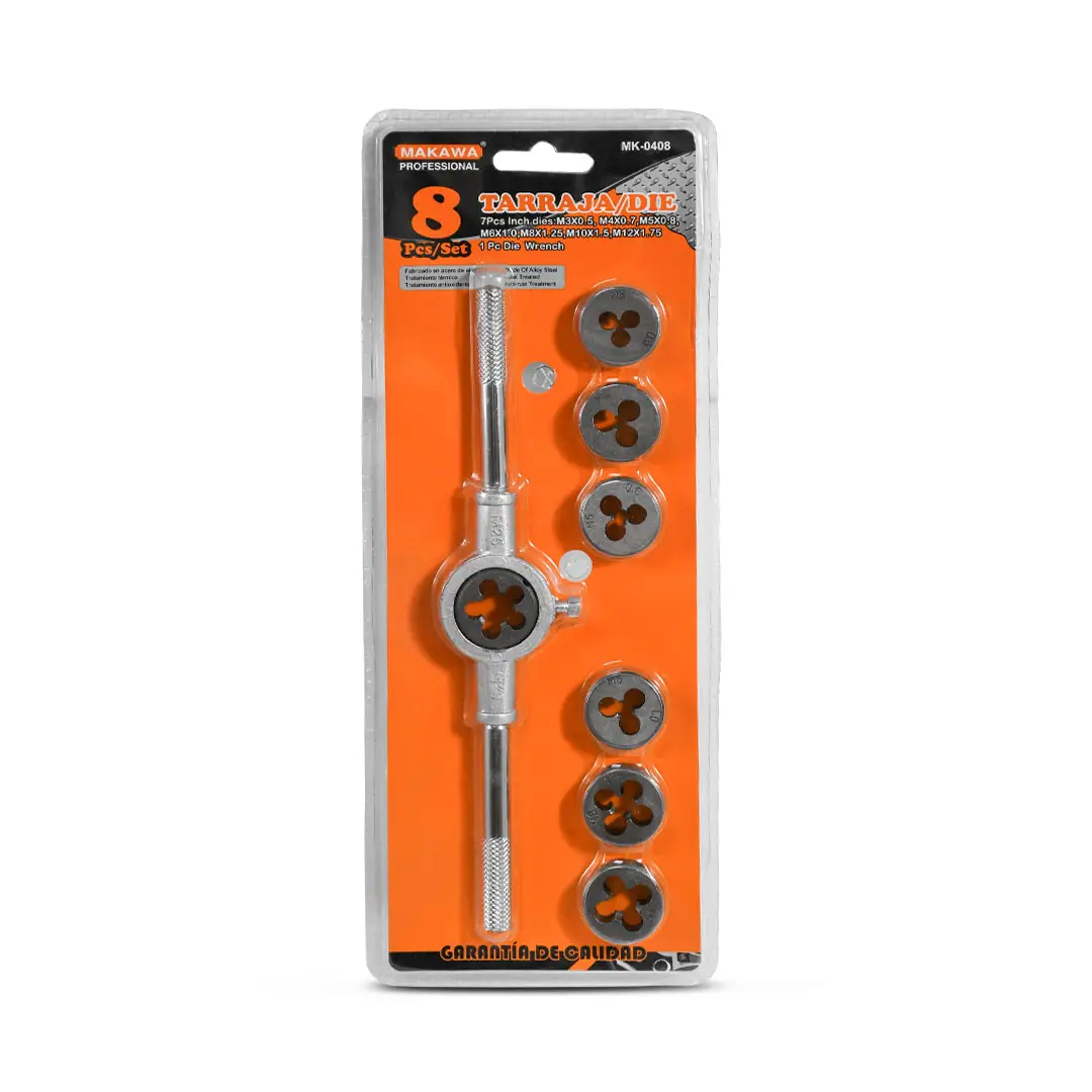 Juego de terraja hembra de 8 piezas en blíster. Se utiliza para crear una rosca en una varilla o caño cilíndrico calibrado o para reparar una rosca en mal estado.