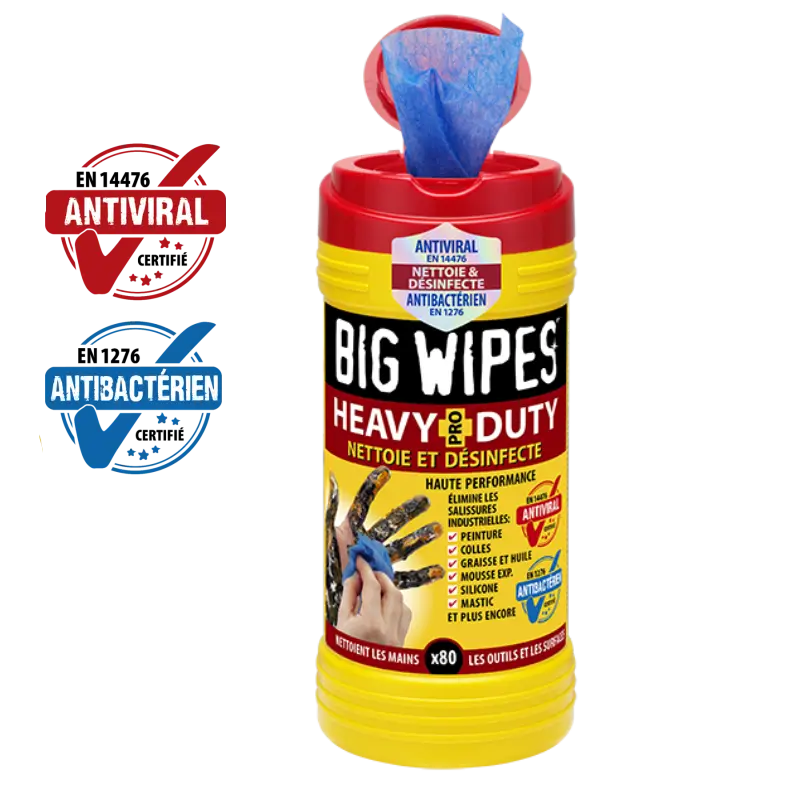 Las toallitas industriales Big Wipes Heavy Duty ofrecen una solución de limpieza rápida y eficiente para manos, herramientas y superficies. Estas toallitas están siempre al alcance y listas para usar en cualquier momento.